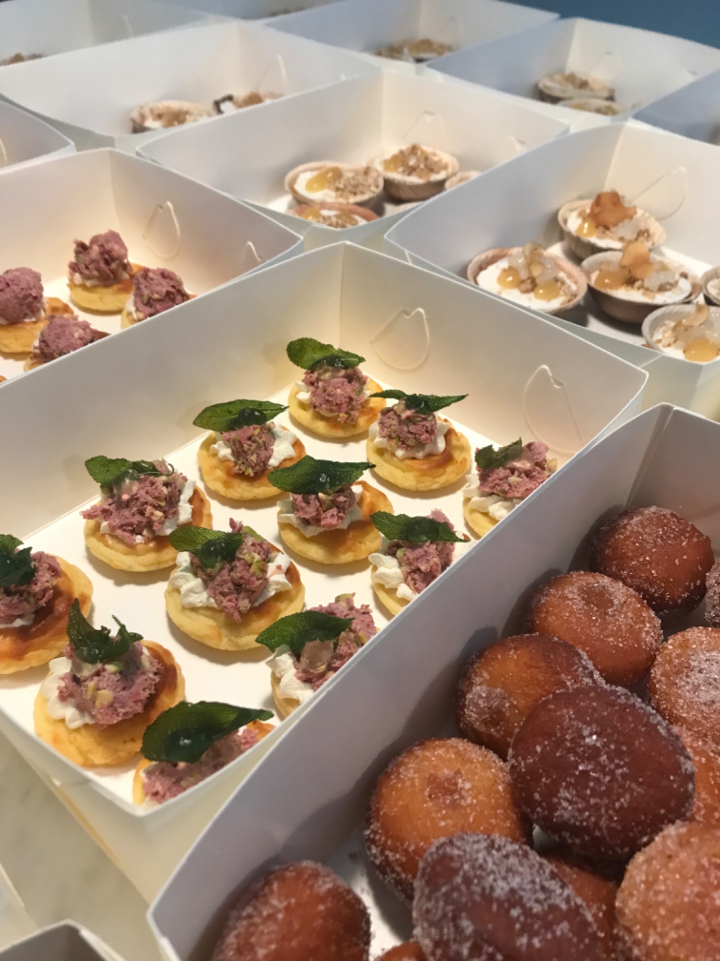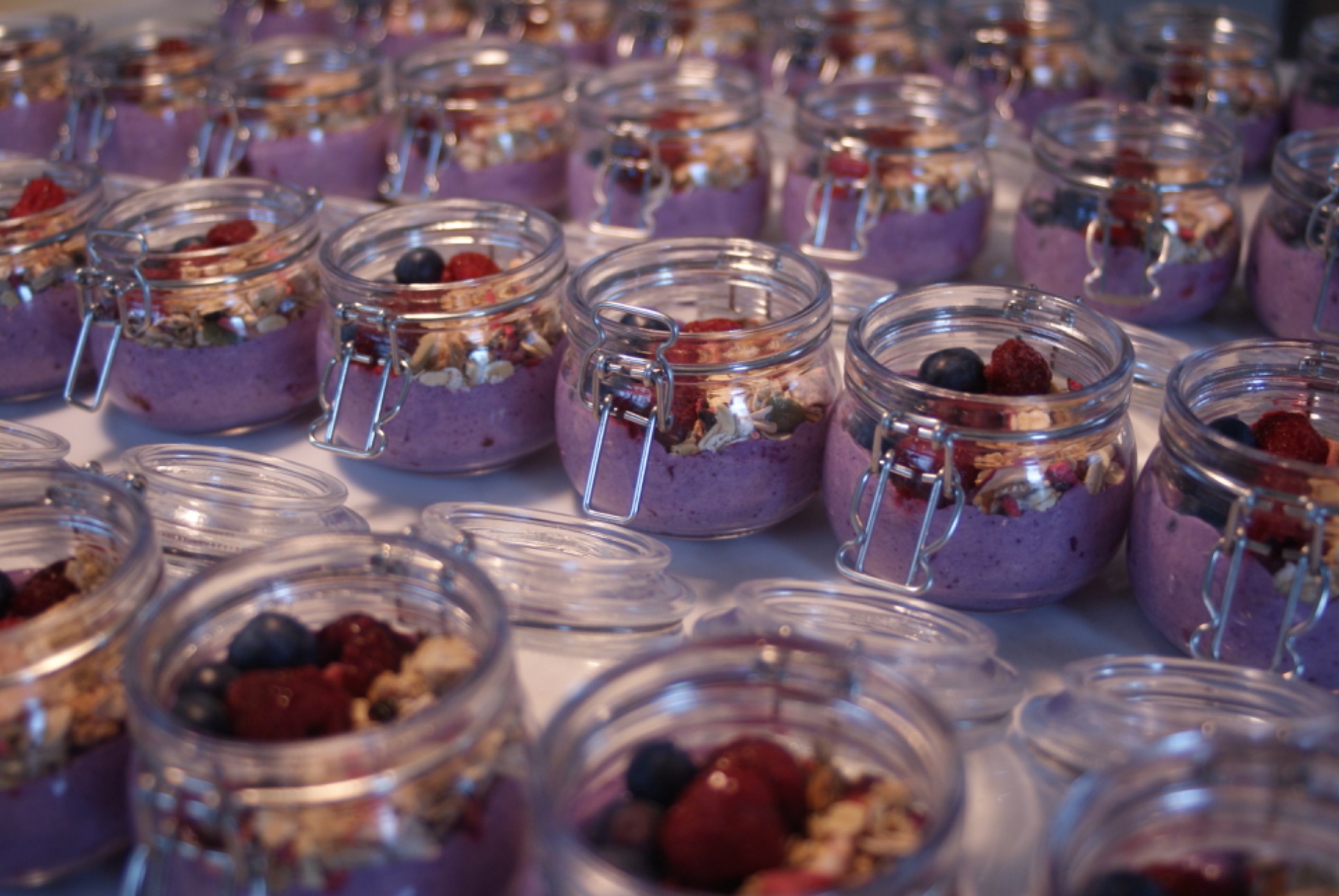 Tuoreita kotitekoisia sämpylöitä, vihanneksilla ja kermajuustolla sekä maalaispalvikinkulla, kotimainen mustikkatuorepuuro marjoilla, tuoremehua, vastakeitettyä kahvia, hedelmiä ja pieniä makeita leivonnaisia